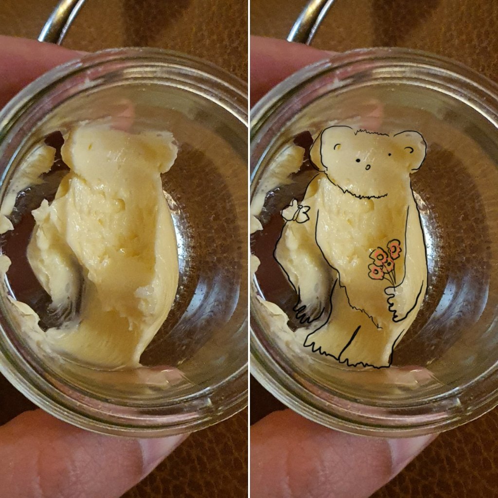 Der Butterbär ist ein sehr gutmütiges Wesen. Es zieht Schmetterlinge magisch an, pflückt Blumen für Fremde und lacht über spritzendes Wasser.