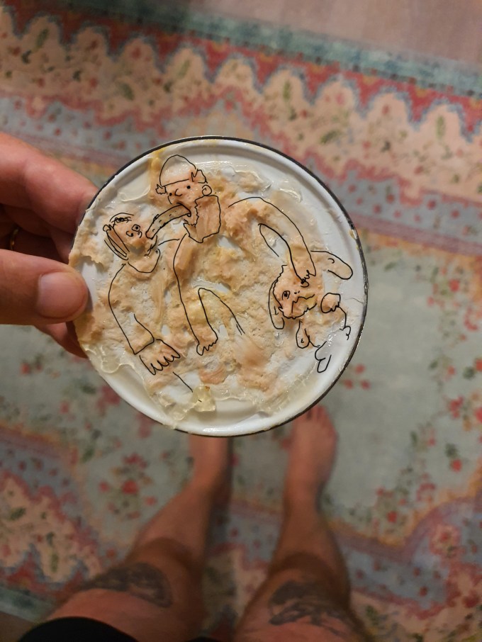Bertram und Bollermann lutschen hier gerade zusammen an einem geräucherten Aal. Das nennt man einen Bobitzer Bonbon. Bollermann hat seinen debilen Hasen mit dabei.