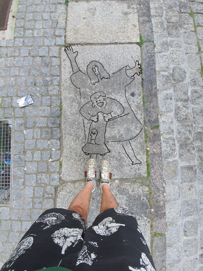 Karl steckt in der Bauchtasche seiner Mutter und spielt mit seinem MannHelmAuto. „Mutter geh auf die Knie!“ ermahnt er sie. Er will die Räder rollen lassen.