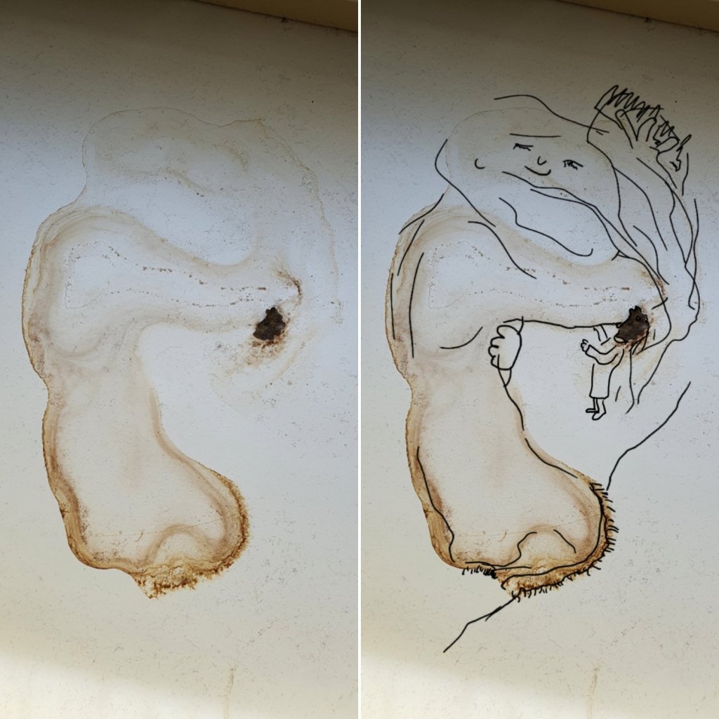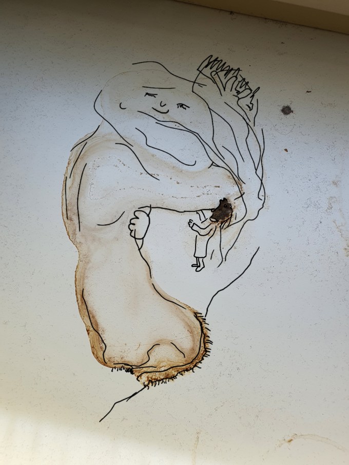 Ja, Du siehst richtig. Das ist eine sich kämmende TausendfüßlerRiesin. Sie heißt Johannax und trägt am Ellenbogen einen Menschenparasiten.