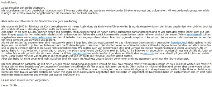 Aber mit Hintergründe meine ich eigentlich Mitarbeiter, die sich bei mir gemeldet haben. Da sind Emails dabei, die wirklich umhauen. Muss da noch mal genauer nachfragen, ob ich diese verwenden und hier (diskret und ohne Namensnennung usw.) veröffentlichen kann, aber es gibt sie. Und sie sind viel, viel schlimmer als meine Erfahrung. Sie umfassen einen Zeitraum (bisher) von 2015 bis 2017 und da muss es auch als Mitarbeiter echt grausam gewesen sein. Und die Bewertungen zeigen, fast keiner hat was gemerkt.