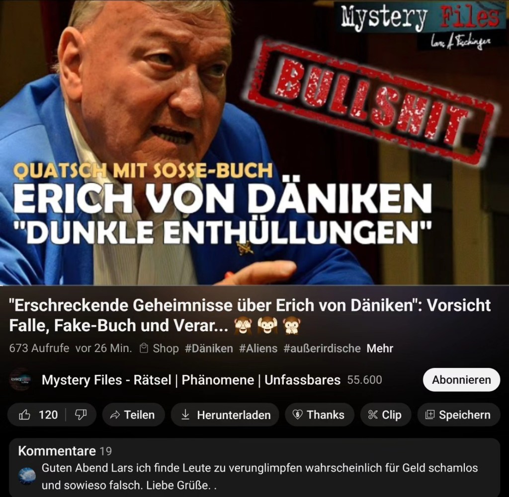 Hier ist das Video zu sehen. Die Kommentare zeigen, was da für Typen am Start sind. Halt das Übliche: Moschdehner ist von der CIA, er ist kein Mensch (Wahrscheinlich Reptiloid) und einer meint, es gäbe pädophile Übergriffe von Moschdehner.