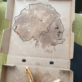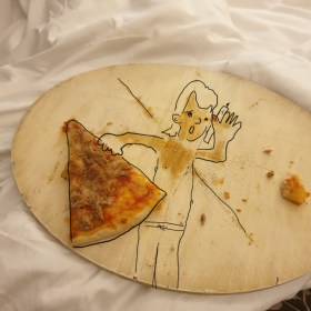Julio will Pizzastück ausliefern und ruft Kunden an.