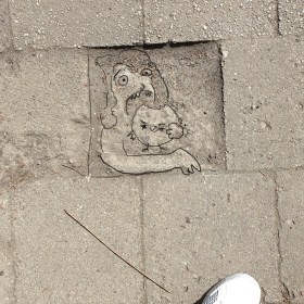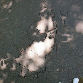 Die verrückte Hertie schaut aus dem Zimmerfenster und ißt ein Küken. Sie holt sie oft aus Haustiergeschäften und erzählt dort, dass sie eine Schlange hat. Sie ist leider Kükensüchtig.