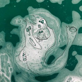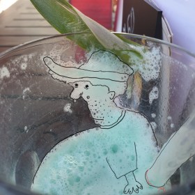 Schaumgeist mit nacktem Menschlein auf der Schulter.