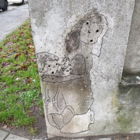 Katzenwesen rutscht Hang hinunter.