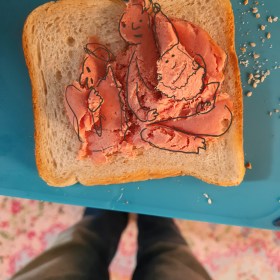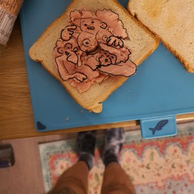 Die Drei in Teewurst auf Toast. Magda mit Enormvertittung, Gonzojochen und der erleuchtete Baktuhn.