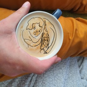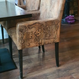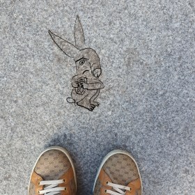 RockerKätzchen Olbitz hebt imaginäre Waffe und ein HornspatzKurt landet darauf.