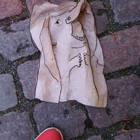 WurmfrettchenTyp singt in Regenjacke gegen den Regen