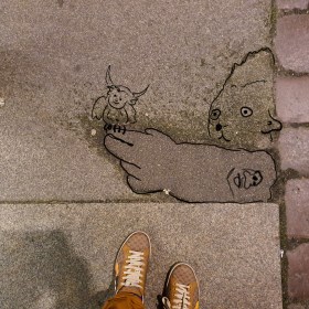 RockerKätzchen Olbitz hebt imaginäre Waffe und ein HornspatzKurt landet darauf.