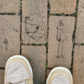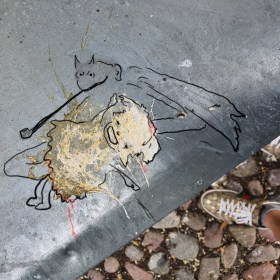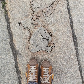 Judith mit angeheftetem Stalkerteufel. Gleich wird sie ihre Regenstachelkugel auf ihn niedersenden.